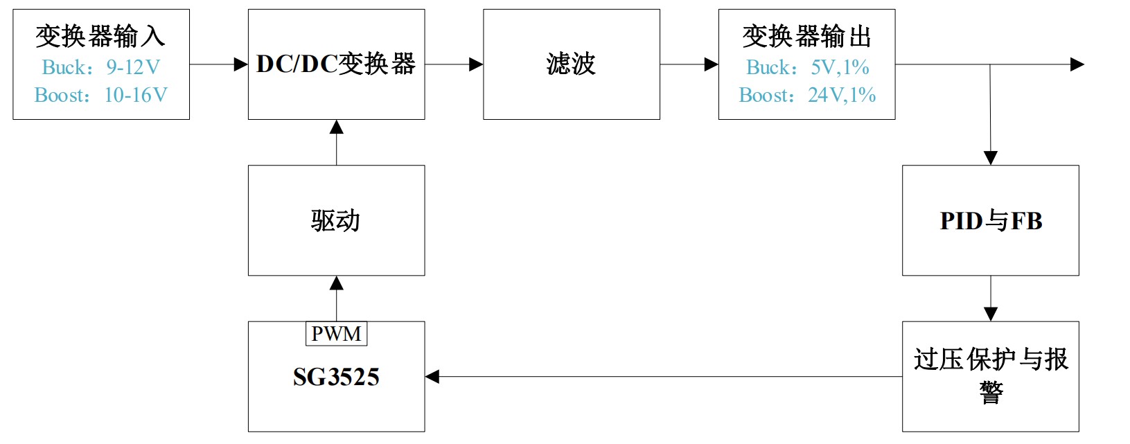 整个基于PWM控制的BOOST变换器包括PWM发生电路、加法电路、驱动电路、主电路(BOOST)、反馈电路、保护电路六个部分。