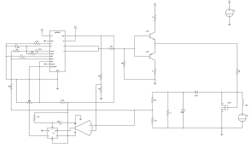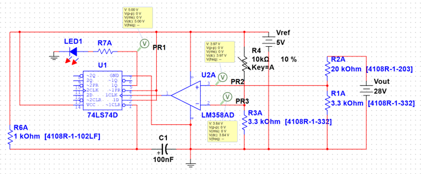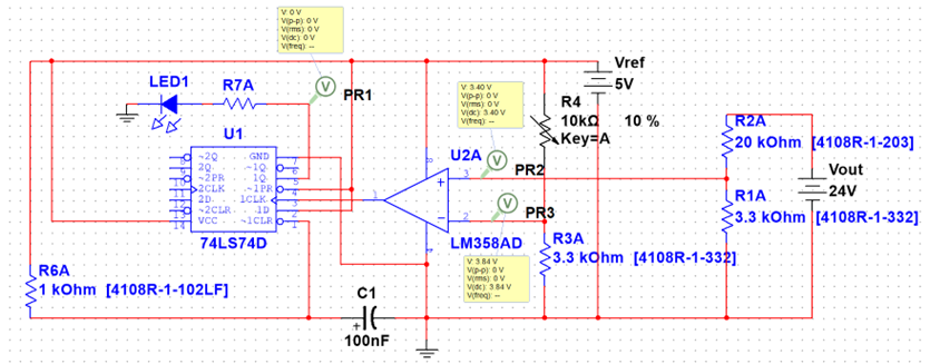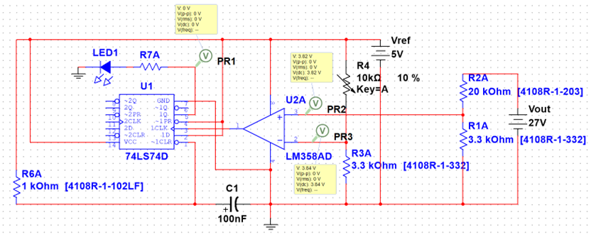 保护电路使用Multisim仿真,SG3525产生5V的Vref,经过10k欧的电位器和3.3k欧电阻分压,输入LM358比较器反向端,输出电压经过20k和3.3k电阻分压输入比较器同向端,若同向端电压高于反向端,LM358比较器输出高电压,否则输出低电压,比较器输出电压输入74LS74的CLK时钟信号,由于D触发器的D端已经置高,每当时钟脉冲来临(即同向端电压高于反向端),Q端就会跟随D端输出高电压5V,经过限流电阻(根据LED的工作电流确定),使报警电路的LED灯亮。