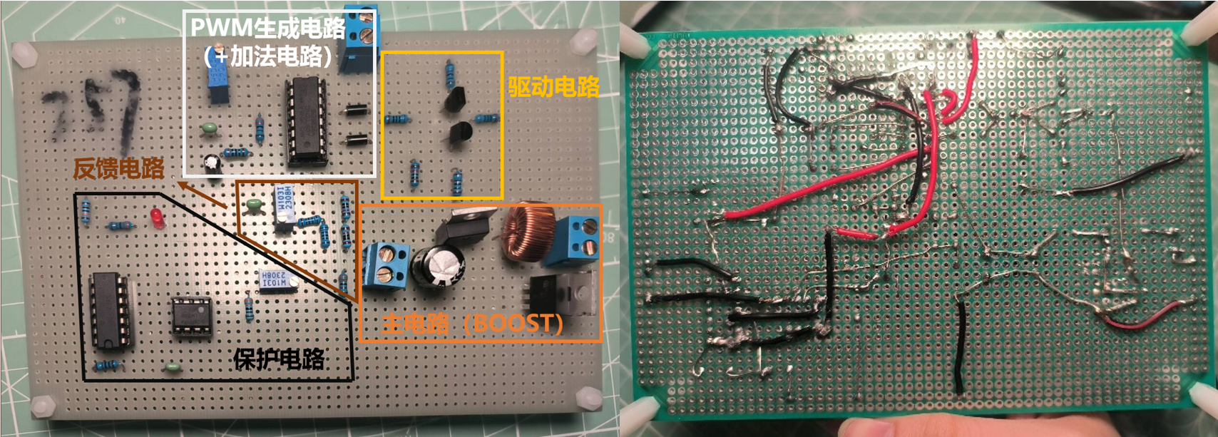 ① PWM 发生电路的核心是SG3525 芯片,可以使用该芯片得到特定占空比的PWM 波。加法电路将SG3525的两个互补输出叠加而成。