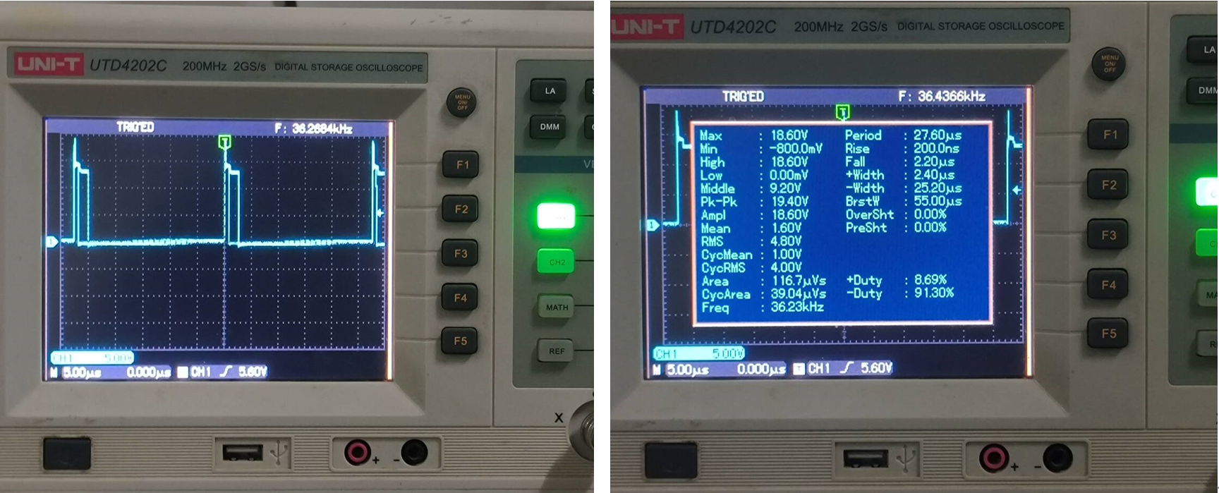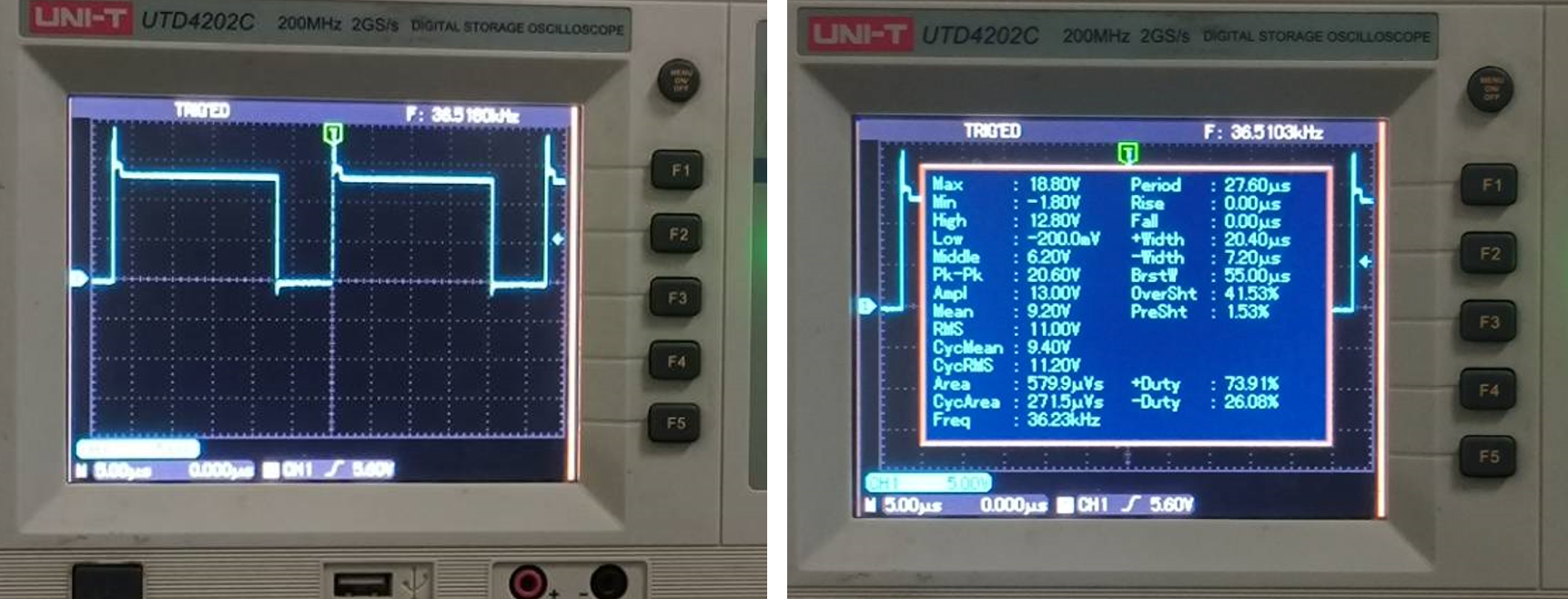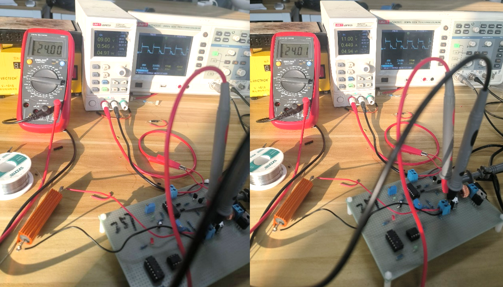 如下图,在输入电压为9V或11V时,示波器上PWM波形占空比自动改变,使输出电压始终保持在24V左右。
