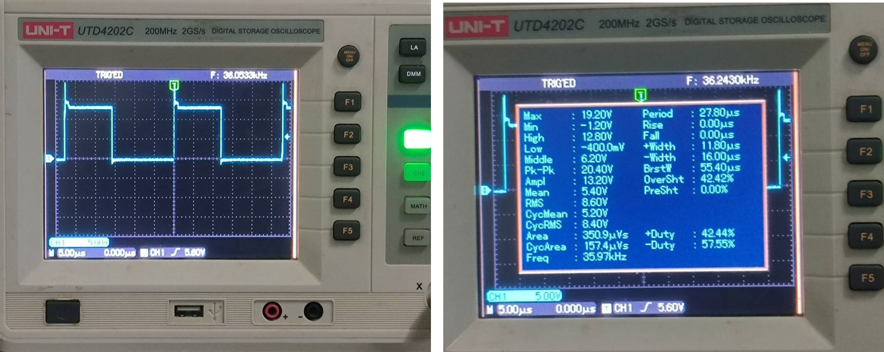 2.PWM波形调试:调节PIN2、16电位器,得到不同占空比的PWM波形。