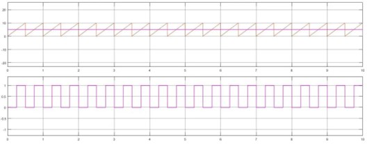5、6、7脚电容电阻确定锯齿波的频率,也为PWM波的频率,输入电压为基准电压经过电阻分压后的一条直线,将该直线与锯齿波比较,若锯齿波较小输出低电平,反之输出高电平,如下图。
