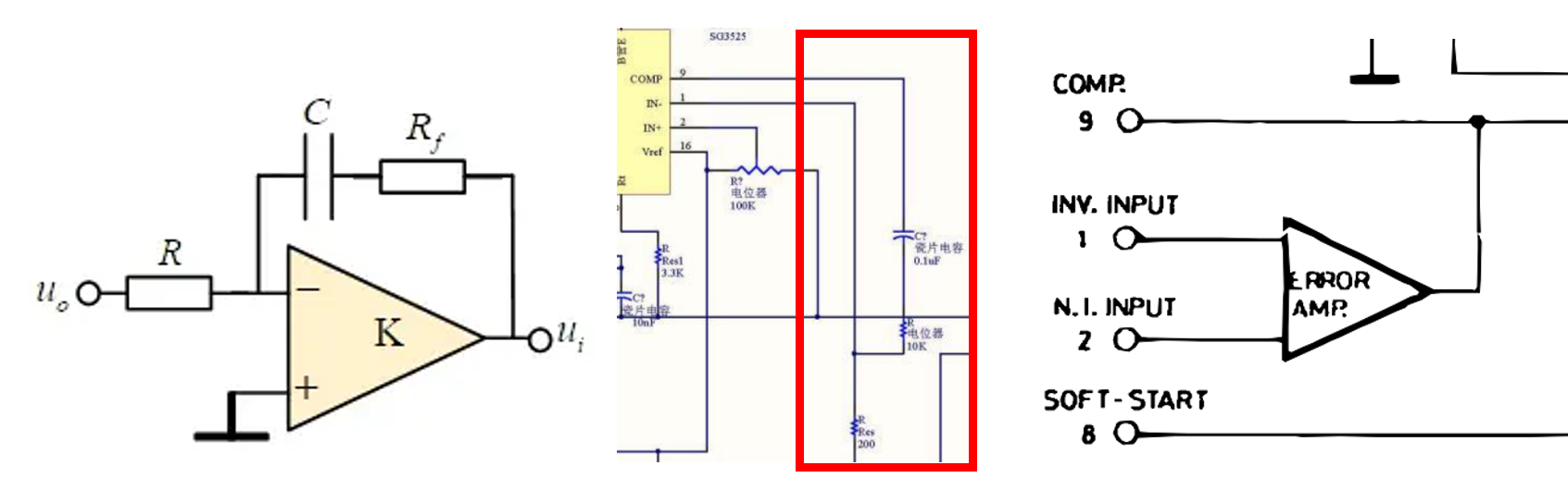 2. 闭环PI参数:参考比例积分环节的电路实现如下,查阅SG3525手册得知PIN1、9之间确实存在一个运算放大器。