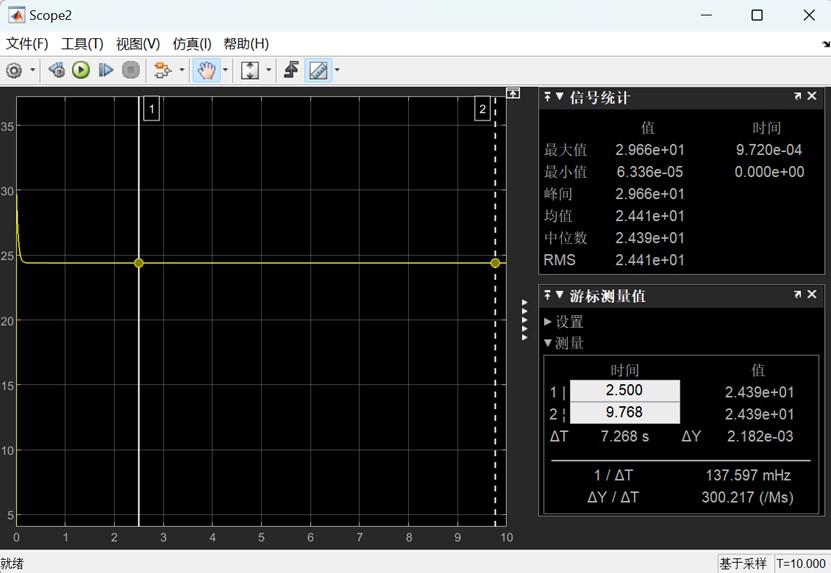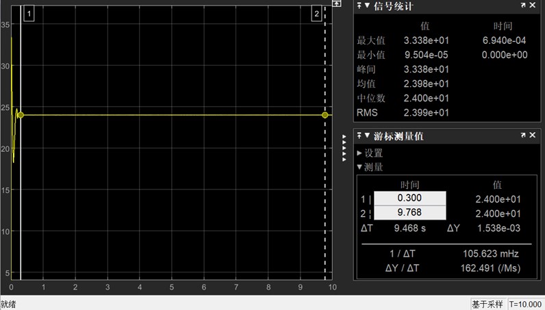 经过参数整定,调节PI参数为0.001和0.5,调参原则:Kp较小时峰值电压不过大,Ki较大时调节时间较短。下图显示在输入电压分别为10V、12V、15V时的输出电压。观察可见,输入电压越高,输出电压峰值、超调量越高,调节时间均小于0.3秒,最终稳定值都是24V。