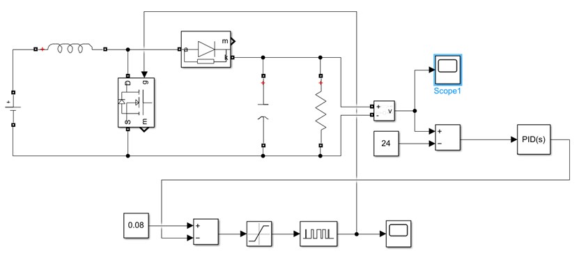 闭环时,将输出电压和24V比较作差,经过PID(实际只使用PI)控制器,调节PWM波的占空比,当误差为正数时,占空比应调小,当误差为负数时,占空比应调大,设初始占空比为8%,因为误差可能较大,设置PI参数应尽量小,与0.08的数量级相同,用0.2与PID输出相减,经过0-1的限幅得到PWM波的占空比,驱动MOSFET。输入电压为10-16V时,自动调节占空比,得到输出电压均为24V左右。此时最终稳定的输出电压也与R阻值无关。