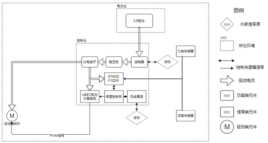 为保证实验安全,在上述供电电路中加入UBEC电池分离系统。当驱动器遇到故障时会自动切断电池引出的所有电压。 通过UBEC系统能够实现实现弱电控制强电、自锁以及保护的功能。