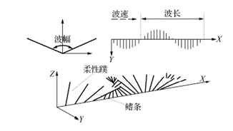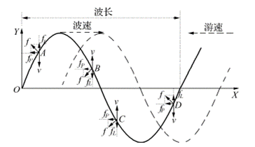 下图给出了波动鳍波动时鳍面波传播从而产生推力的示意图,图中实线是当前时刻的鳍面波,虚线是下一时刻的鳍面波 , A 、B 、C、D 是鳍面的 4 个微小体元. 从中可知 , A 点靠近 X 轴运动,由于流体阻力 ,它在垂直鳍面的方向上受到一个阻力 f ,且可分解为 X 方向 (纵轴) 上的fP和 Y 方向(侧轴) 上的 fL ;同理 , B、C和 D 点也受到类似的fP 和fL . 在一个波长内,对所有微小体元所受到的 fP 和 fL 进行积分 ,可知 fL 相互抵消,而 fP 的大小为各个微小体元所受 fP 的绝对值累加 ,方向与鳍面波的传播方向相反。这样 ,在整波长内 ,作用在鳍面上的合力为与波传播方向相反的推进力 ,且所有体元均对此有贡献。