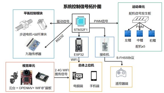 整个系统运行在 STM32F1中,数据收发电路主要包括的硬件有:2.4G收发图传模块、无线模块、以及IPEX通讯接线等。 由于系统支持RS232通讯协议,因此电机驱动器和各个传感器之间通过线型连接,采样频率可达到1KHZ,精确同步时间小于 50μs,完全满足数据交换的要求。而九轴传感器采用卡尔曼滤波输出最终上传到控制器。