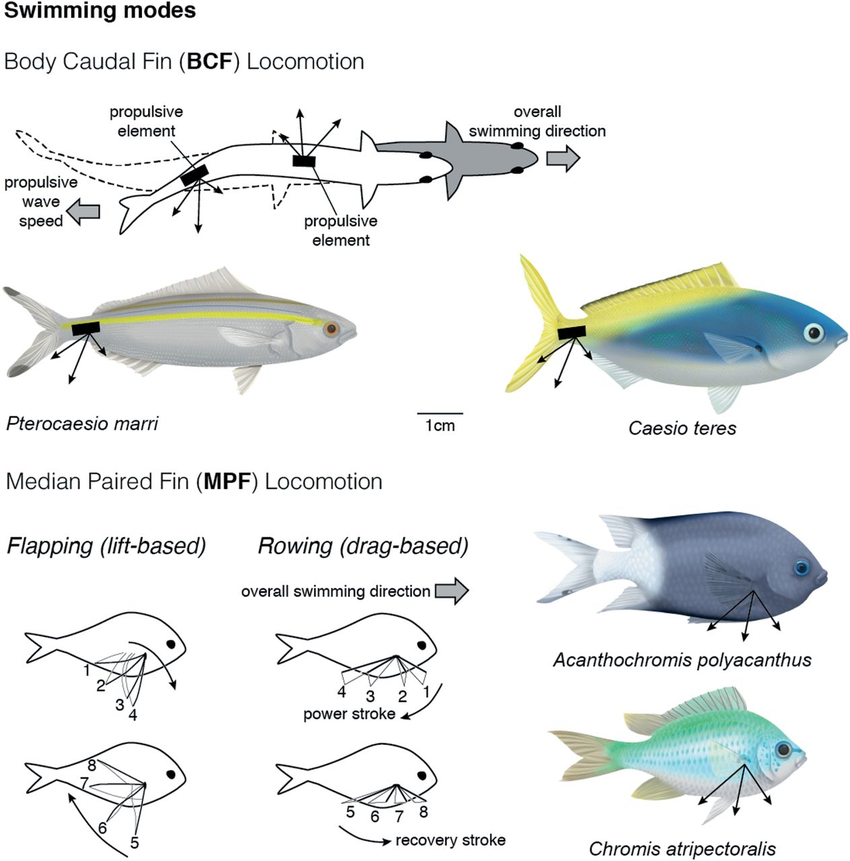 由于流体的可变性与复杂性,鱼类游动的推进机制的研究相比其他领域更加复杂,随着流体力学的导入,在水洞实验,流体建模与数值计算的帮助下对鱼类推进机制产生了许多不同的理论。以下将展示一种波动鳍鱼类推进的近似模型供设计参考。