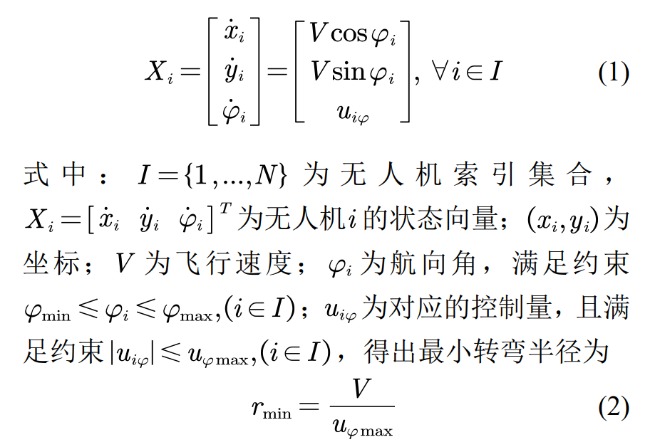 动力学性能影响任务路径设置和到达时间计算,在任务规划计算时主要考虑速度范围、转弯半径、最大爬升角和最大下滑角等限制,部分研究进一步简化为二维空间的速度与转弯半径限制。设任务场景包含N架无人机,则二维笛卡尔坐标系下无人机的运动学模型为[12]