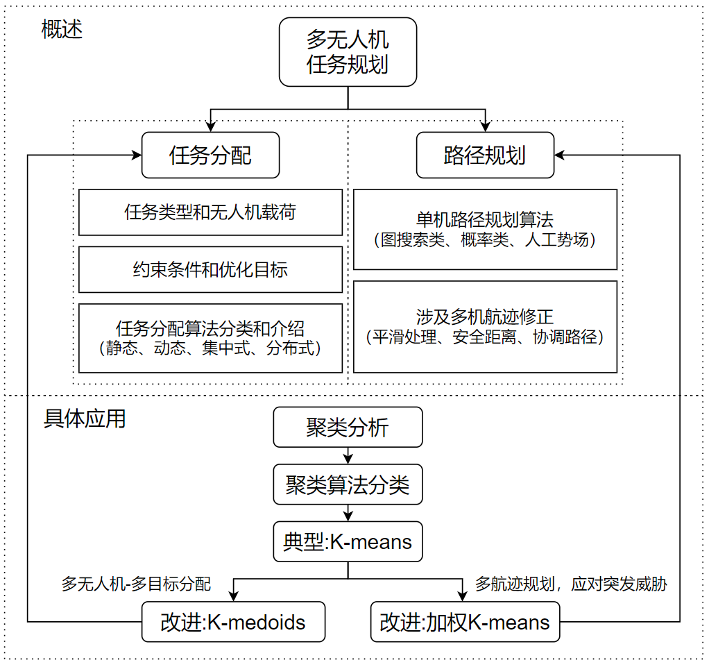 面对这一重要课题,本文研究总结了多无人机在任务规划方面的发展现状和关键技术,首先分别概述了任务分配、路径规划的主要过程和算法,然后以具体算法为例,介绍聚类经典算法K-means的基本原理以及在任务规划中的应用,最后对多无人机协同任务规划做了总结和未来发展方向的预测,论文整体框架如图3所示。