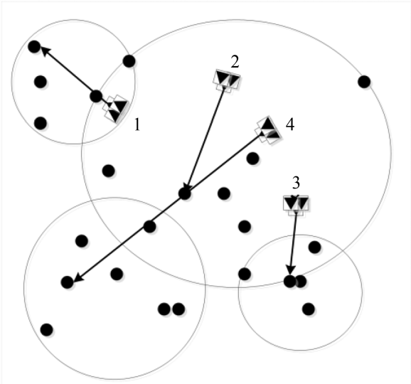 针对任务类型相似而目标对象有多个时,也需要进行任务/目标的分配,利用聚类方法将距离相近的目标聚成一类派出同一架无人机,可以缩小无人机移动的范围。而上述K-means算法的k值确定是一个难点,则可以根据无人机的数量确定k值,或者根据簇群数量反向确定无人机数量进行任务分配,通过K-means这样确定中心点建立目标簇完成编队级目标分配, 就可将最近的目标簇分配给该无人机编队, 如图6,简化了多无人机——多目标分配问题[50], 从整体上提高了目标分配求解效率。