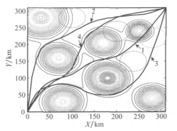 文献[47]提出了将粒子群优化(particle swarm optimization, PSO)算法与加权K均值聚类算法相结合的规划方法。每个粒子表示一条航迹,采用加权K 均值聚类算法对粒子进行分类,得到多个粒子子群,在每个子群内部进行一条可行航迹的优化,最终得到多条不同的可行航迹。针对K均值聚类算法对初始值敏感的问题,文献对此进行改进,采用排挤机制产生初始聚类中心;针对实际环境中突发威胁的分布不均性,在聚类过程中,对航迹节点按照所在区域突发威胁的出现概率进行加权,提出了加权K 均值聚类算法。仿真实验表明,所提出的方法能够有效地得到无人机的多条可行航迹,如图7所示,K=4时生成4条航线,其中航迹1和4的初始路径相似,在中后半段有所不同,在全局静态条件下,航线1具有最小的代价是最优的,但航线1前方有突发威胁时,只要及时发现危险,则能够有效地从最优航迹1切换到航迹4。若没有进行多航迹规划或利用加权K均值算法,则无法应对这种突发情况。