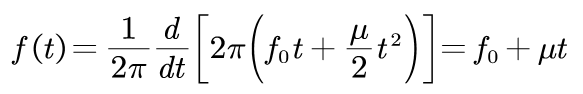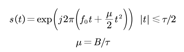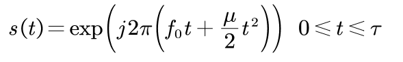 LFM指频率随着时间线性增加(上变频)或减少(下变频)的信号,其复数表达式为: