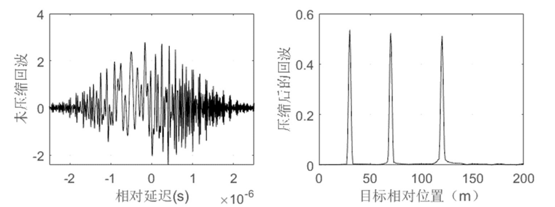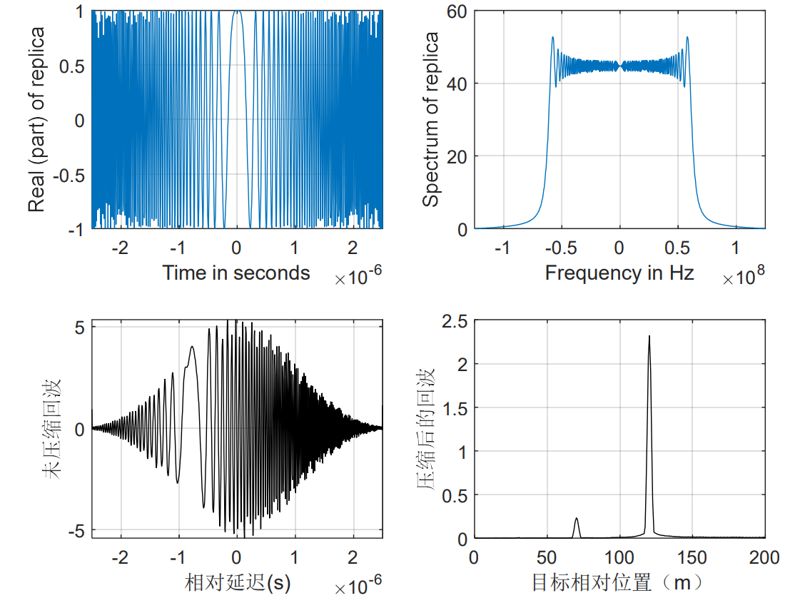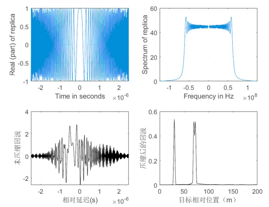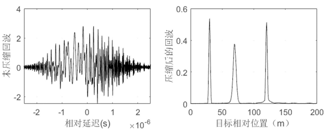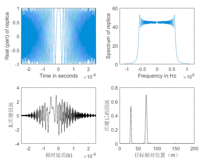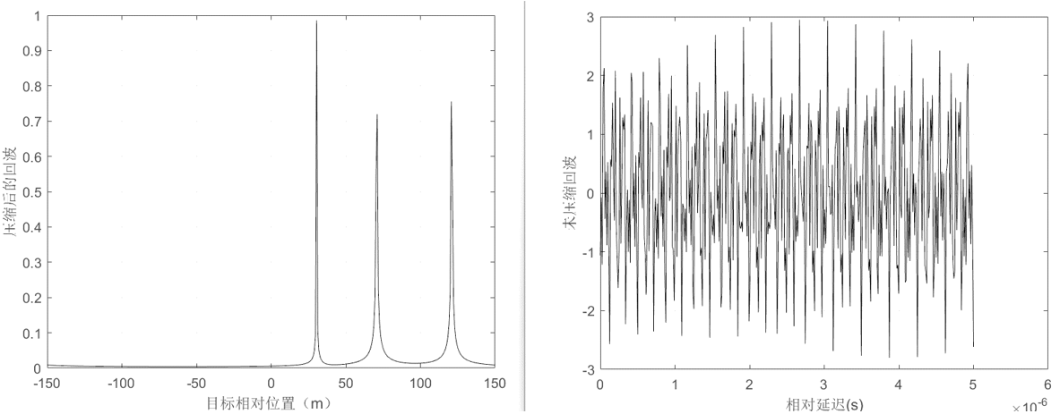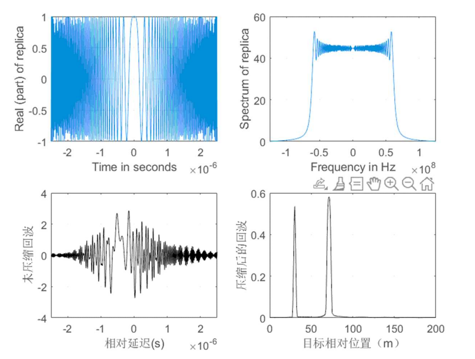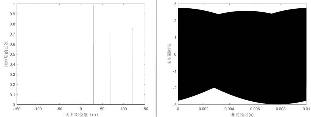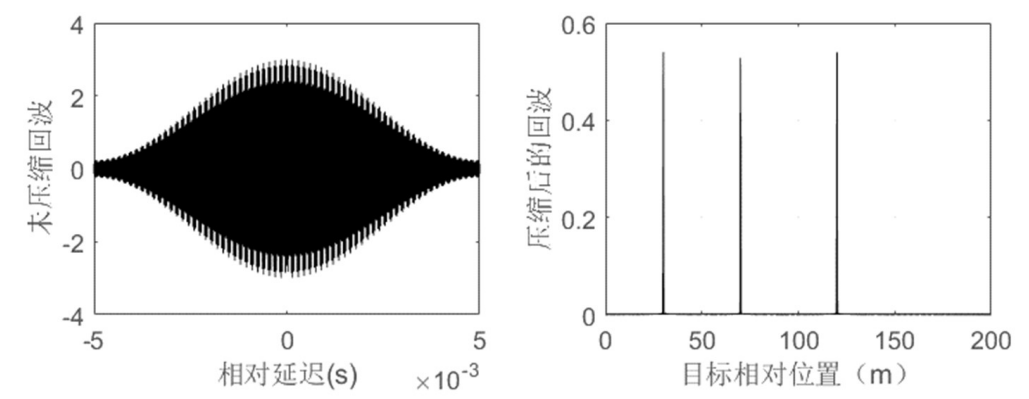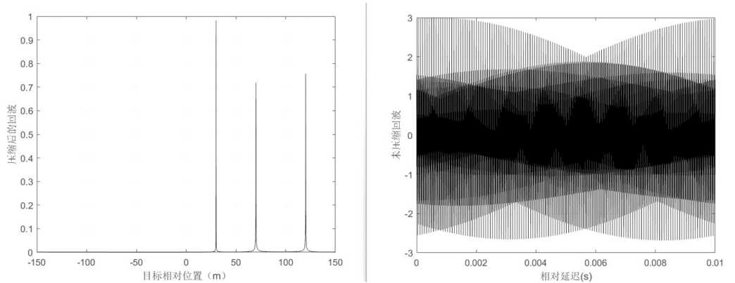 l 第32-49行,先通过FFT转换到频域然后进行匹配滤波器相关运算,再转换回时域,将距离作为横坐标画出图4:压缩之后的回波信号(可分辨)