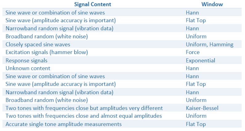 每一种加窗函数都有其特征和适用范围。要估计信号的频率成分以选择加窗函数。窗函数的选择可以参考下表。