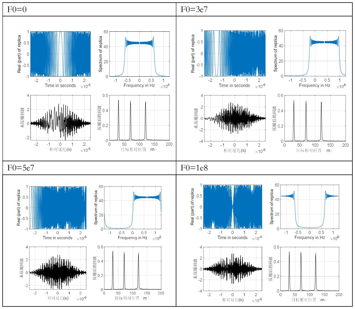 图上表现在发射信号在时域和频域中心频率的偏移,未压缩的回波信号也有所不同,但对压缩之后的回波信号没有什么影响,这与前文提到的对回波信号进行消除f0的处理有关。