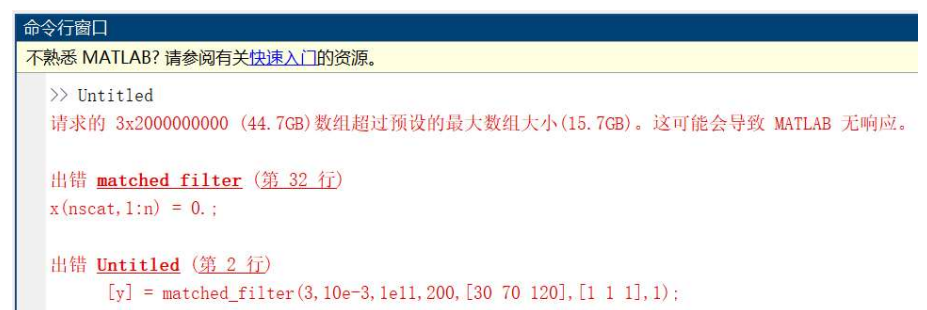 匹配滤波器:出现内存不足的现象,问题在于“采样点数太多” 减小taup为10e-6可以 结论:如果直接采样的话因为频带很宽所以在高频的时候需要的采样率就很大,采样点数就很多,所以要经过去斜处理。 执行 [y] = matched_filter(3,10e-3,1e11,200,[30 70 120],[1 1 1],1);