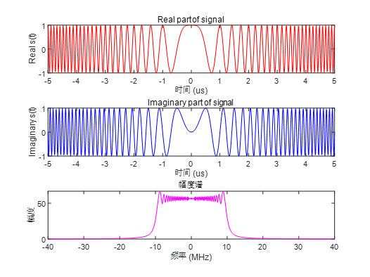 当B =20MHz,τ=10μ s时,线性调频信号在时域和频域上的波形如下图所示: