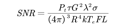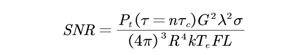 其中,Pt是峰值功率, τ是脉冲宽度,G是天线增益,o是目标的RCS,R是距离,k是玻尔兹曼常数,Te是有效噪声温度,F是噪声系数,L是总的雷达损耗。