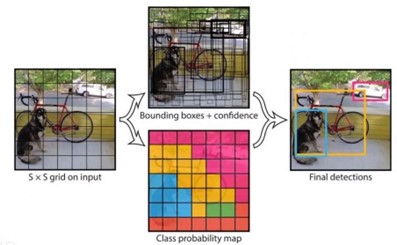 YOLOv5(You Only Look Once)是一种有监督的深度学习算法,可以实现 end to end,输入一张图片不需要经过任何处理直接通过模型就可以得到结果。它的基本思想如下图所示:经过卷积神经网络得到一定大小的特征图,将特征图划分为S*S 的栅格(grid cells),每个栅格负责对落入其中的目标进行检测,一次性预测所有栅格所含目标的边界框(bounding boxes)、定位置信度(confidence)、以及所有类别概率向量(class probability map),其中:边界框表征目标的大小以及精确位置, 置信度表征预测框的可信程度,取值范围 0~1,值越大说明该矩形框中越可能存在目标,类别概率向量表征目标所属类别的可能性。
