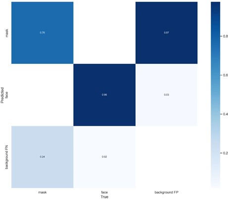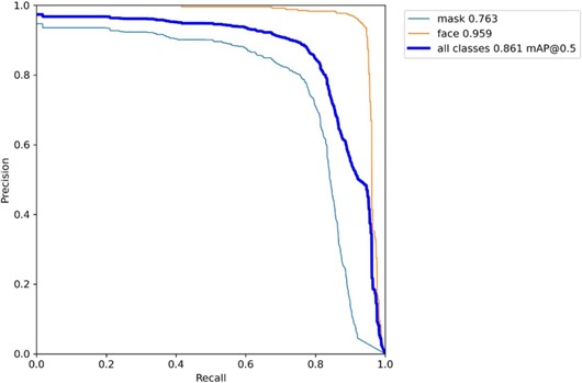 由图可以看出,验证集一共有 400 张图片,1362 个标签(口罩 1023 个, 人脸 339 个)。总体的精度为 0.865,召回率为 0.852,mAP 值达到了 0.861, 但人脸和口罩的mAP 值分别是 0.959 和 0.763,可见模型总体的训练效果较好,对人脸识别的训练效果优于口罩。