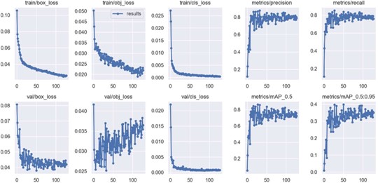 调试发现:①置信度越小,则不符合目标特征的对象越可能会被框选。置信度过大,符合目标特征的对象可能不会框选,经测试 0.25 为较优值。②NMS 的值并不会对检测产生明显的变化,推测这是由于 Anchor 参数已经被设置为小目标检测模式导致的。③训练轮数在 127 时已经和最后的最优结果(epoch=27)相差无几,继续增加训练轮数没有太大意义。