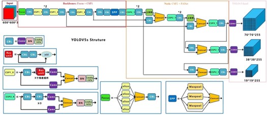 YOLOv5 提供了 YOLO5s、YOLOv5m、YOLOv5l、YOLOv5x 的四种模型,这几种模型的网络结构相似,YOLOv5s 是四种网络中最小最基础的模型,其他的三种模型都是在其基础上加深深度和加宽宽度。YOLOv5s 模型基于残差网络(ResNet)架构,采用多尺度预测的方式,用于目标检测和识别。它的优点在于尺寸小、速度快,适合在移动设备或嵌入式系统中使用。但由于模型尺寸较小,准确率可能会有所下降。但由于考虑到我拥有设备的算力大小,和需要的模型规模大小,选择使用 YOLOv5s 模型,最符合设计需求。