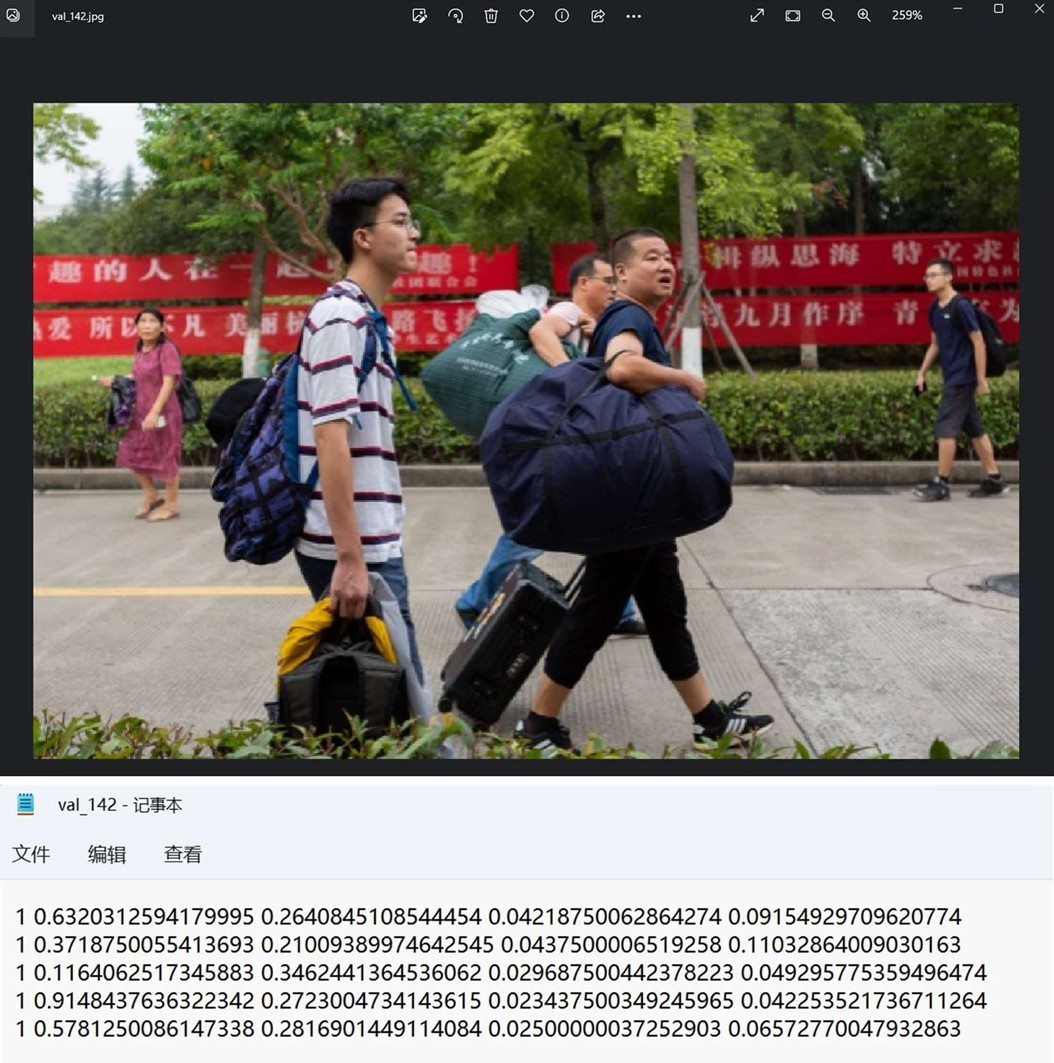 文本文件中每一行表示一个目标,以空格进行区分,分别表示目标的类别信息(0 代表 mask,1 代表 face),和归一化处理之后的中心点 x 坐标、y 坐标、目标框的 width 和 height。